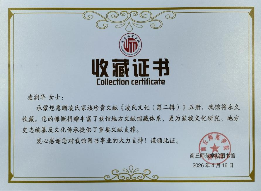 近日,凌润华女士再次向我馆慷慨捐赠凌氏家族文献《凌氏文化(第二辑)》,本书资料丰富、底蕴深厚,书中第一部分为凌润华女士亲笔撰写的自传《忠烈英雄凌唐佐后裔——凌润华》,生动展现了作为南宋忠烈凌唐佐后裔的家族传承与个人历程,凌唐佐曾为商丘知府,为国捐躯,是商丘宝贵的历史文化遗产;第二部分为凌瑞明所著的《我们是周文王第几世裔孙》,详细梳理了凌氏家族的溯源脉络,印证了凌氏源于姬姓、尊康叔为始祖的历史渊源。凌润华女士表示,希望以此次捐赠为契机,让凌氏宗亲会成为凝聚家族力量的纽带,让《凌氏文化》成为滋养凌氏子孙的精神家园,同时让更多人了解凌氏文化的深厚底蕴。