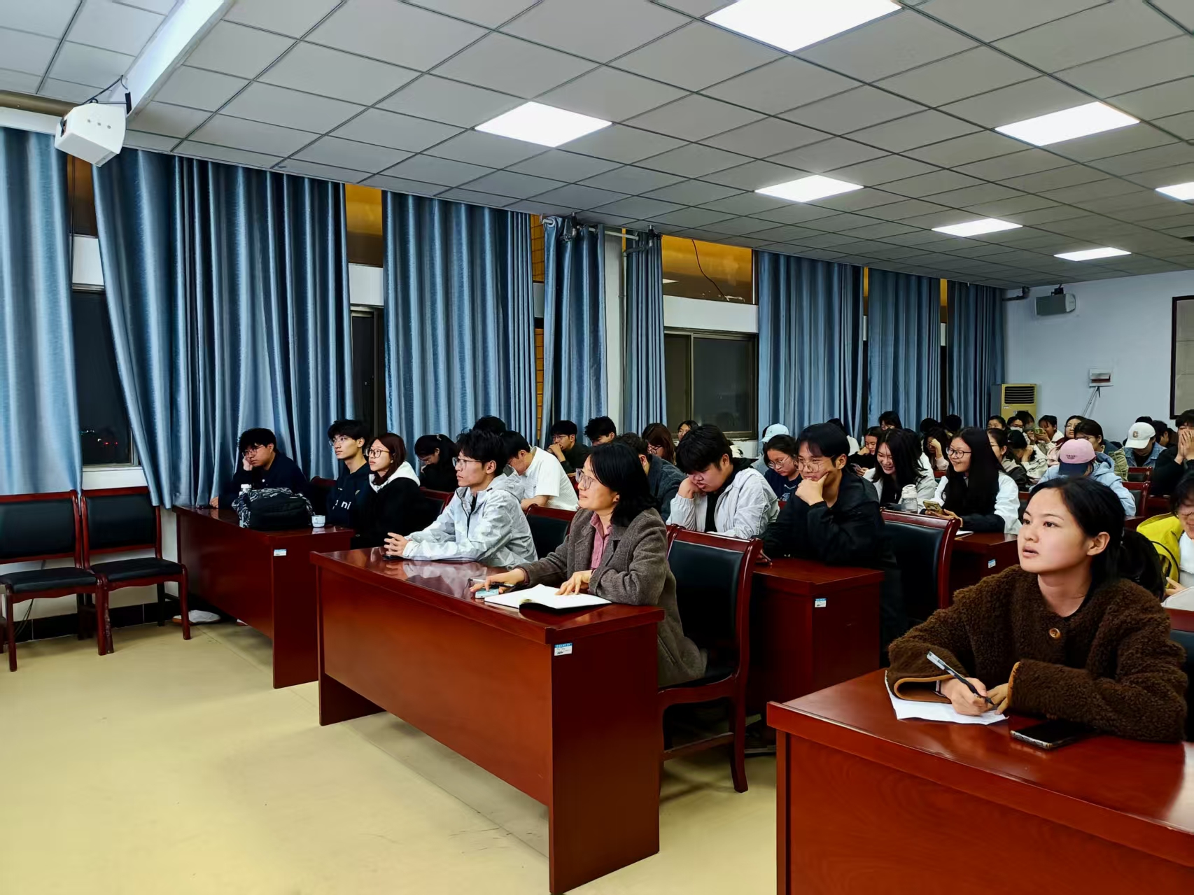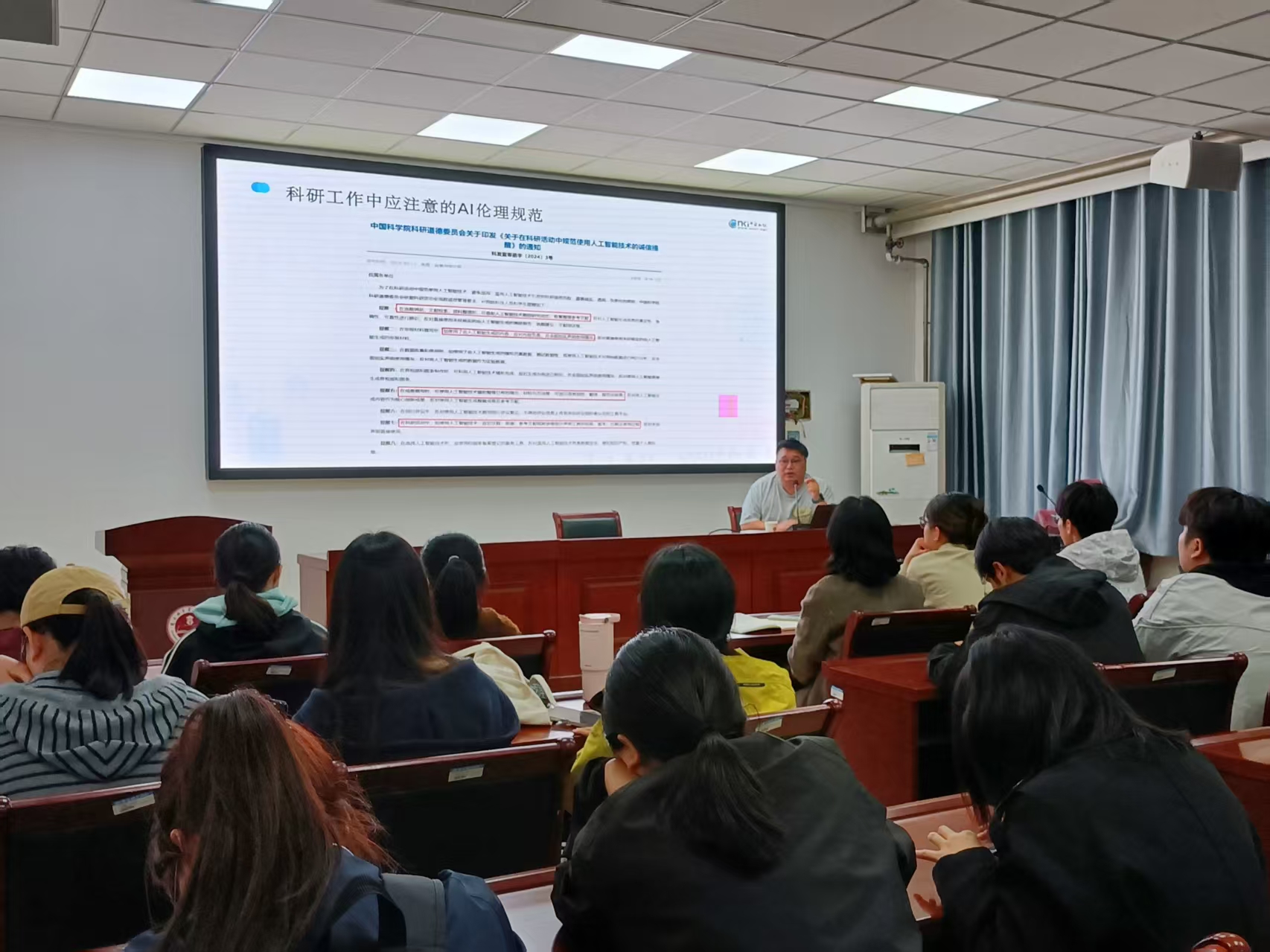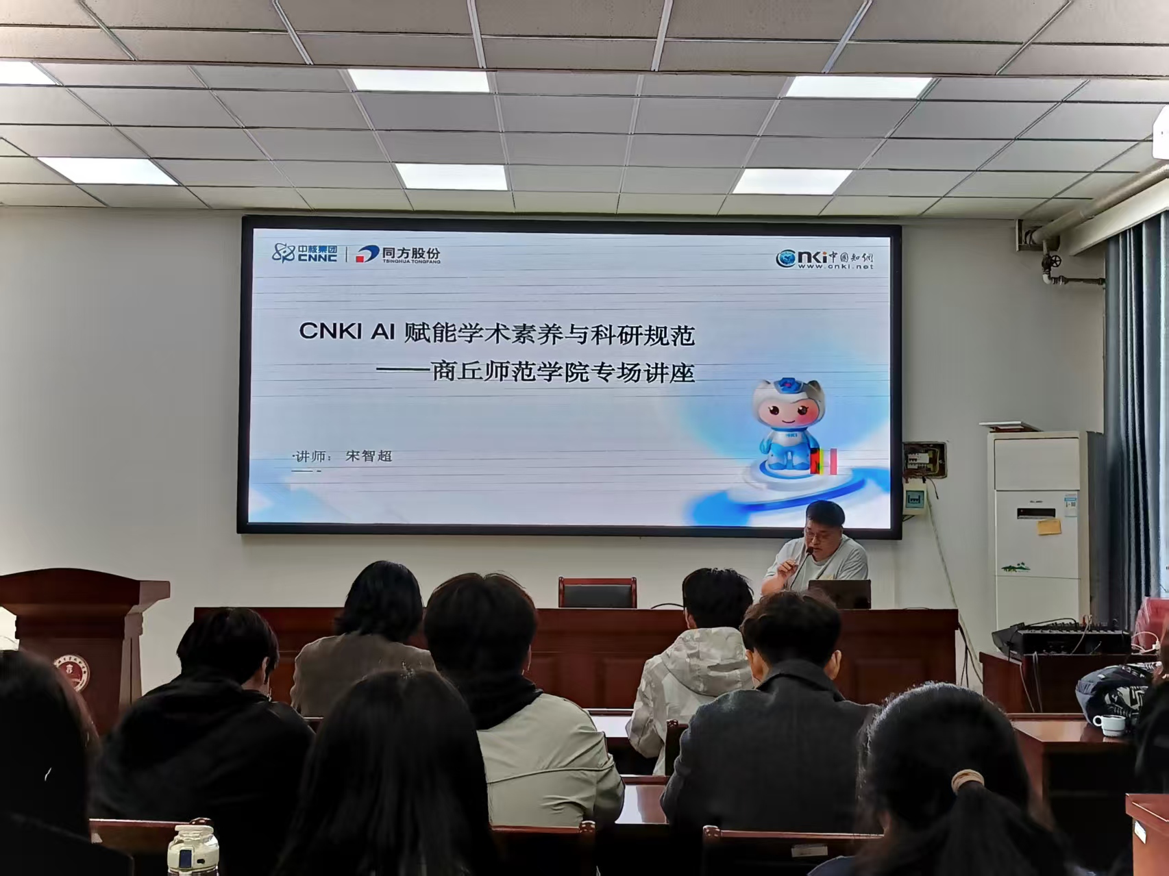 讲座中,宋老师围绕三大核心内容展开讲解:在“AI素养:未来学术生存法则”环节,他剖析AI对学术研究的革新,强调AI素养的重要性;在“科研初体验:CNKI资源初探与巧用”部分,他现场演示CNKI使用技巧,解决同学们文献检索的困惑;在“搭建个人AI学术工作流”环节,他结合案例,为同学们搭建高效规范的学术工作框架。讲座通俗易懂、干货满满,同学们认真聆听、积极记录。